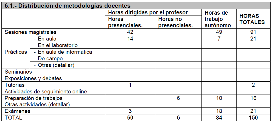 Esta asignatura tiene 6 créditos ECTS. Se entiende que un crédito ECTS tiene unas 25 horas, de las que en el caso de esta asignatura 10 son de actividades presenciales y 15 de trabajo personal del alumno. En consecuencia, la dedicación del estudiante debe de ser de 150 horas. El aprendizaje se articulará en las siguientes actividades: