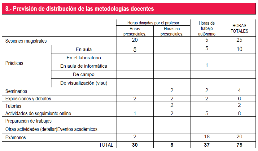 Las competencias propuestas se lograrán a través de varias metodologías docentes: - ACTIVIDADES INTRODUCTORIAS: para tomar contacto con los alumnos, presentar la asignatura y dar información sobre el desarrollo de la docencia y la evaluación. - CLASES TEÓRICAS: Sesiones o clases magistrales: explicación de los contenidos de la asignatura. - MATERIALES EN STUDIUM: en la plataforma Studium se pueden dejar apartados de algunos de los Temas del programa y diversos materiales (normativa, resoluciones, artículos, etc.) - PRÁCTICAS: Análisis, resolución y debate de un supuesto relacionado con las materias que vayan siendo objeto de explicación. Estudio de casos, planteando situaciones a las que se debe dar una solución en derecho, considerando que es una titulación no jurídica. - CLASES PRÁCTICAS: las prácticas se resuelven en clase de forma guiada con participación activa de los estudiantes y debate moderado. - SEMINARIO, EXPOSICIÓN, DEBATE: Eventualmente, y según el desarrollo de la asignatura: Seminario/s (para profundizar en algún tema, ampliación de contenidos de sesiones magistrales), Exposición (de alguna cuestión o temática propuesta), Debate/s (presencial o en Foro, sobre temas de actualidad, individuales o entre grupos). Todos en horario de clase. - TUTORÍAS: Atención, orientación y resolución de dudas de los alumnos, bien individualmente o en grupo. |
