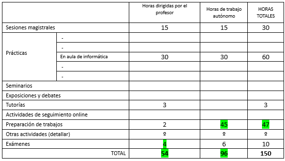 Los temas se presentarán en clases magistrales y se ampliarán en clases prácticas en aula de informática. Los estudiantes tendrán que contrastar lo aprendido mediante consultas bibliográficas, con lo que se estimulará el aprendizaje por descubrimiento y el refuerzo.
